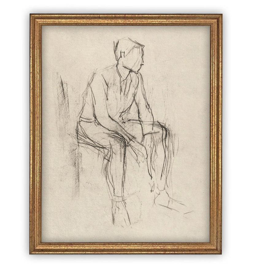 This 11x14 canvas print is a reproduction (not an original painting) that captures the unique patina of the artist's original work - complete with grain, cracking, and general wear. Displayed in a gold frame, the Black and White Sketch of Man brings charm and character to any living space.