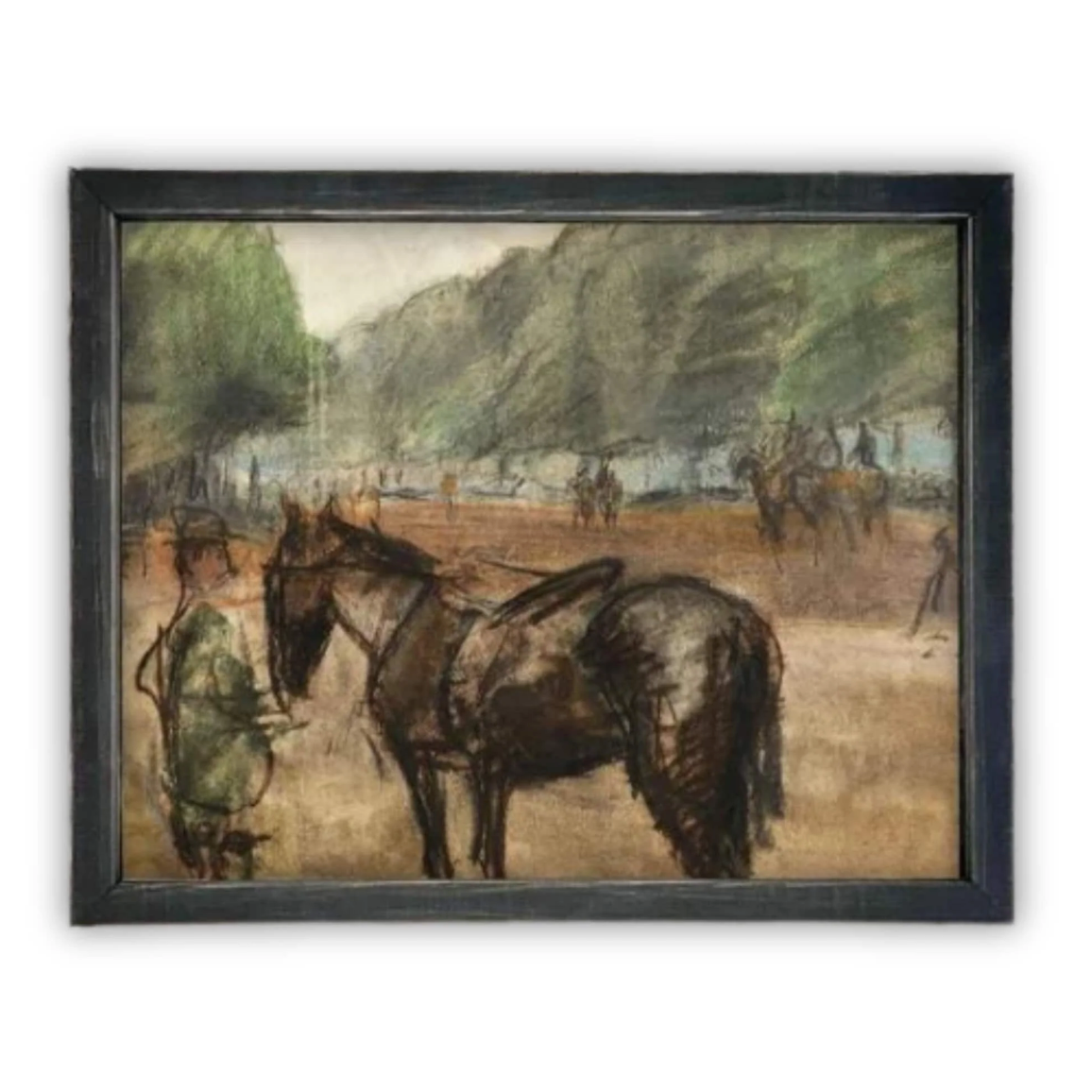 Elevate your space with the Horse and Rider Framed Print 12" x 16” vintage reproduction art, masterfully printed on premium canvas. Each piece captures the charm and character of the original artwork, including its authentic patina, intricate grain, subtle cracking, and natural signs of age. These imperfections are not flaws but features, enhancing the beauty and realism of the painting, offering a timeless aesthetic that brings warmth and sophistication to any setting.