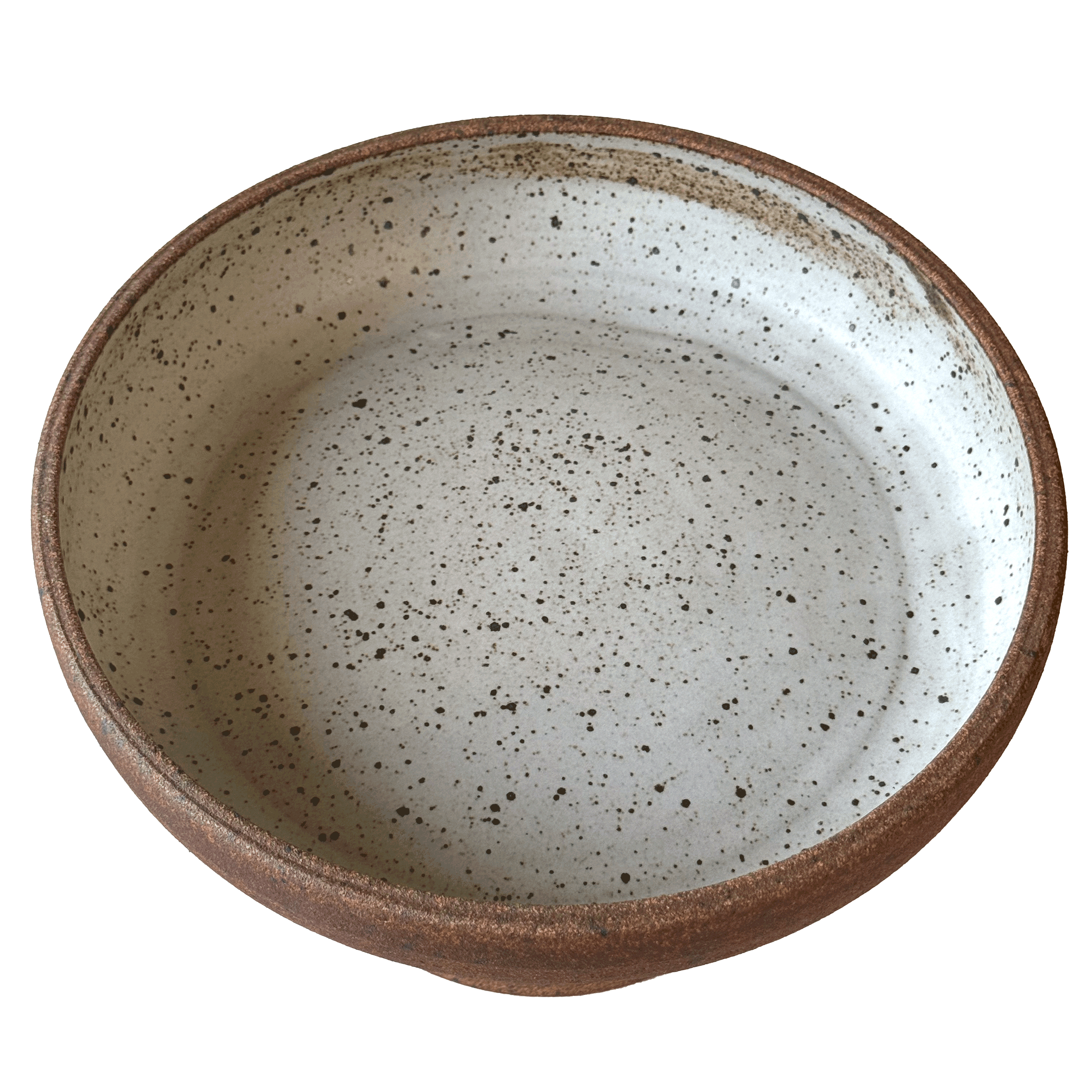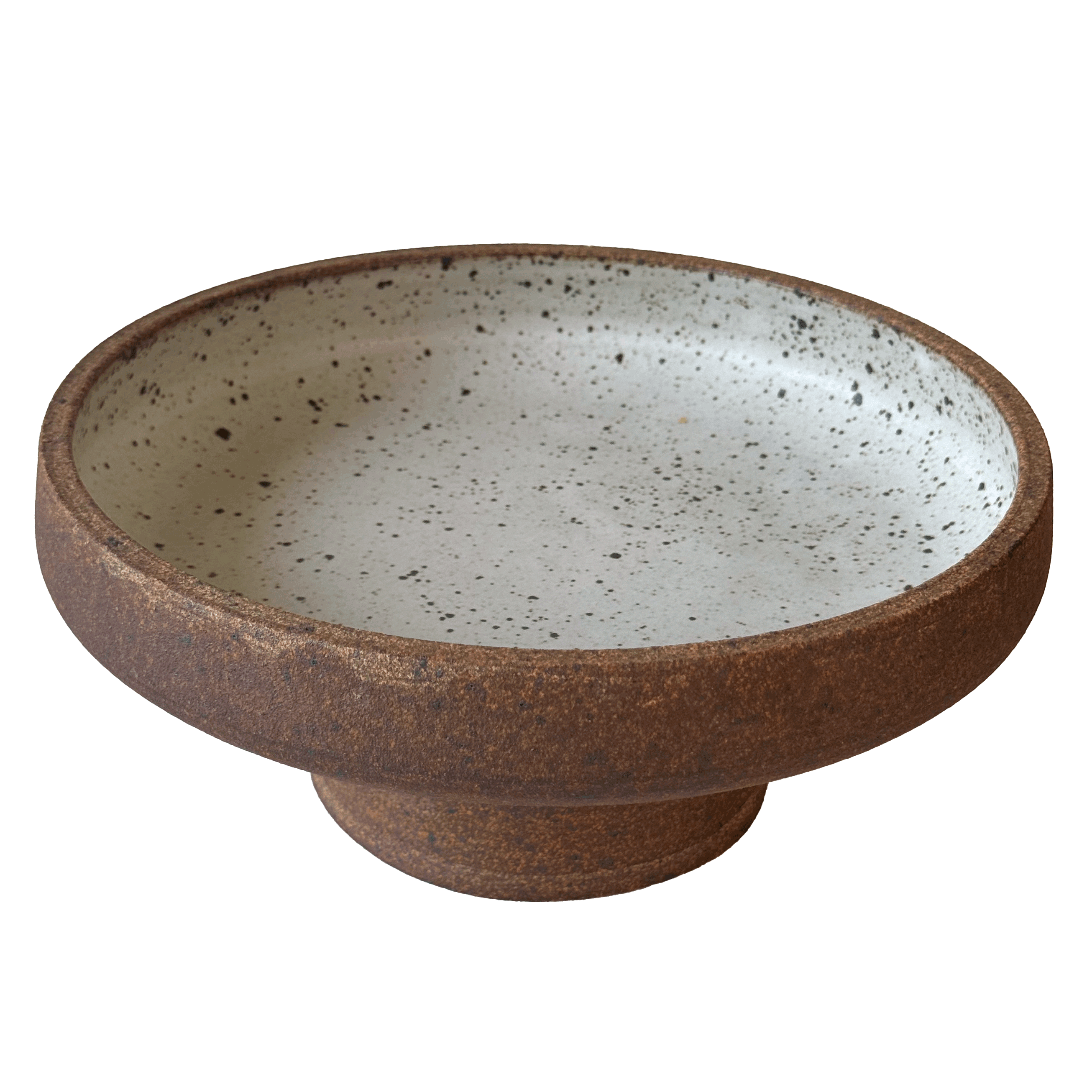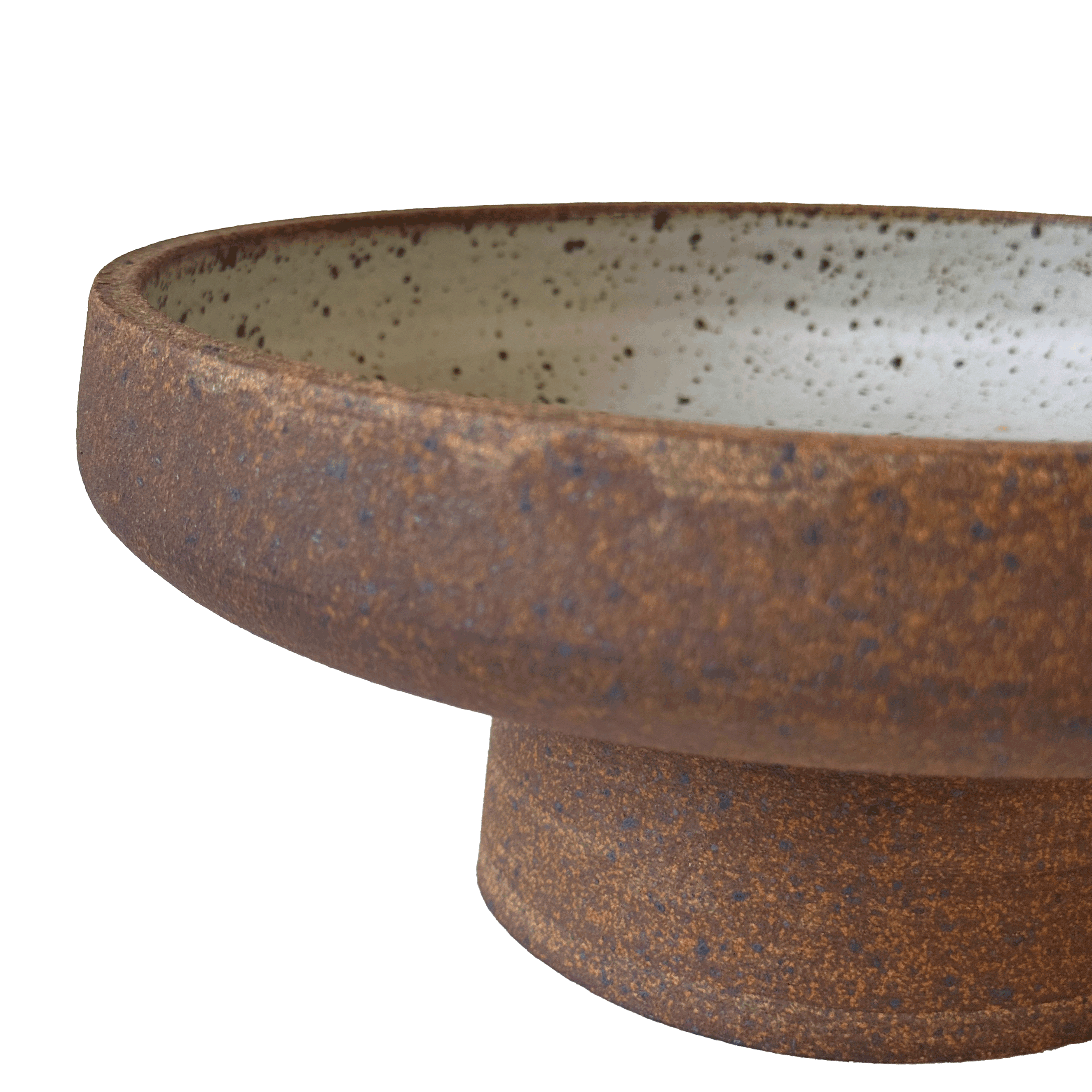 A striking centerpiece for your table, made from wheel-thrown stoneware. This 9" pedestal bowl has a food safe glazed interior and raw clay exterior. Due to its textured exterior this bowl is best used for display or dry foods such as fruit, nuts, and crackers. Sandstone clay body has dark iron specks and ranges from sandy beige to warm brown.