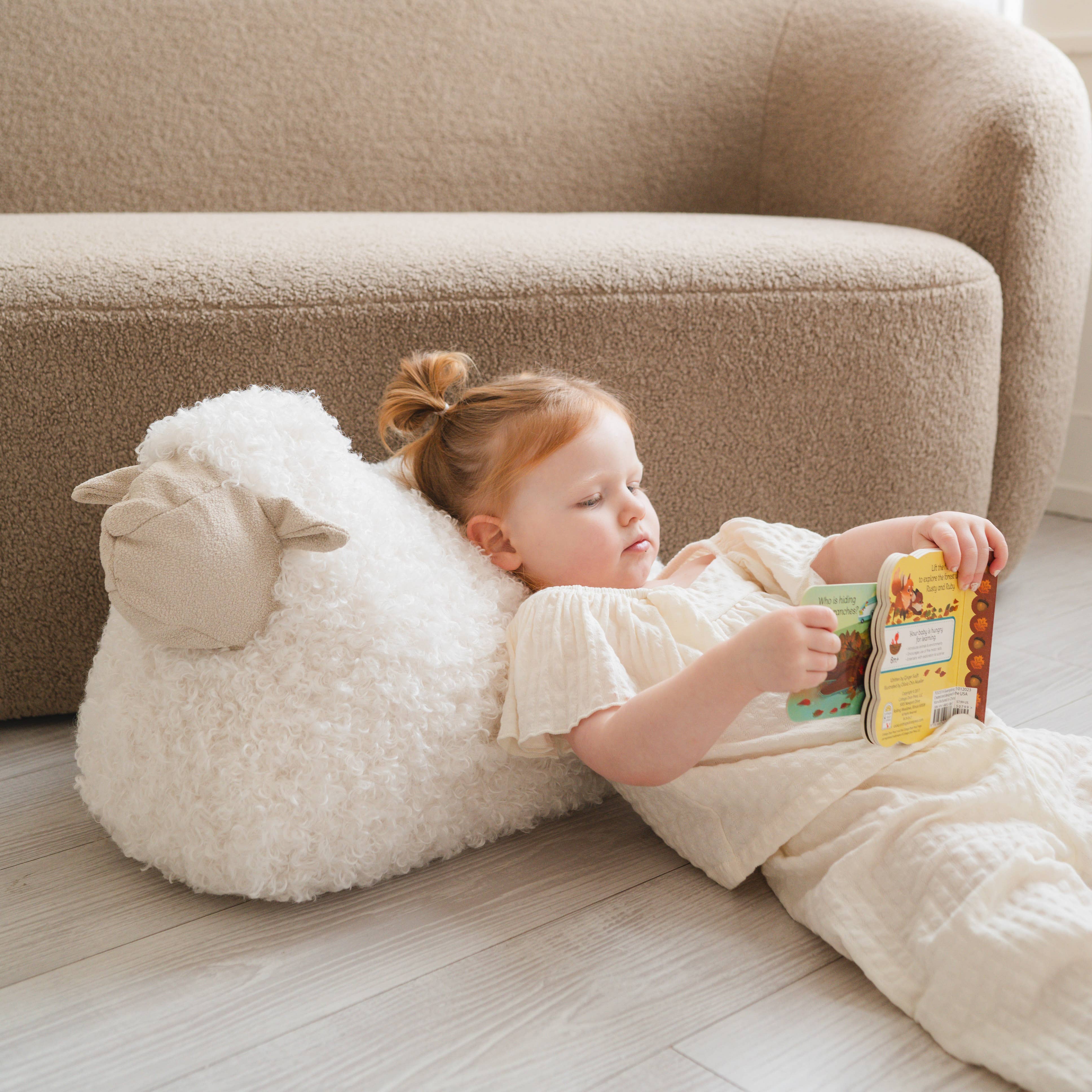 The BAA BAA Sheep Pouf Ride-on Toy features a soft, hairy exterior, ideal for children to develop balance and climbing skills. Its washable cover can be easily removed via a zipper at the base. Filled with durable EPP beans, the pouf provides stable seating that endures over time, making it suitable as a floor cushion even after your child outgrows riding it. The head is cushioned with soft PP cotton for added comfort.