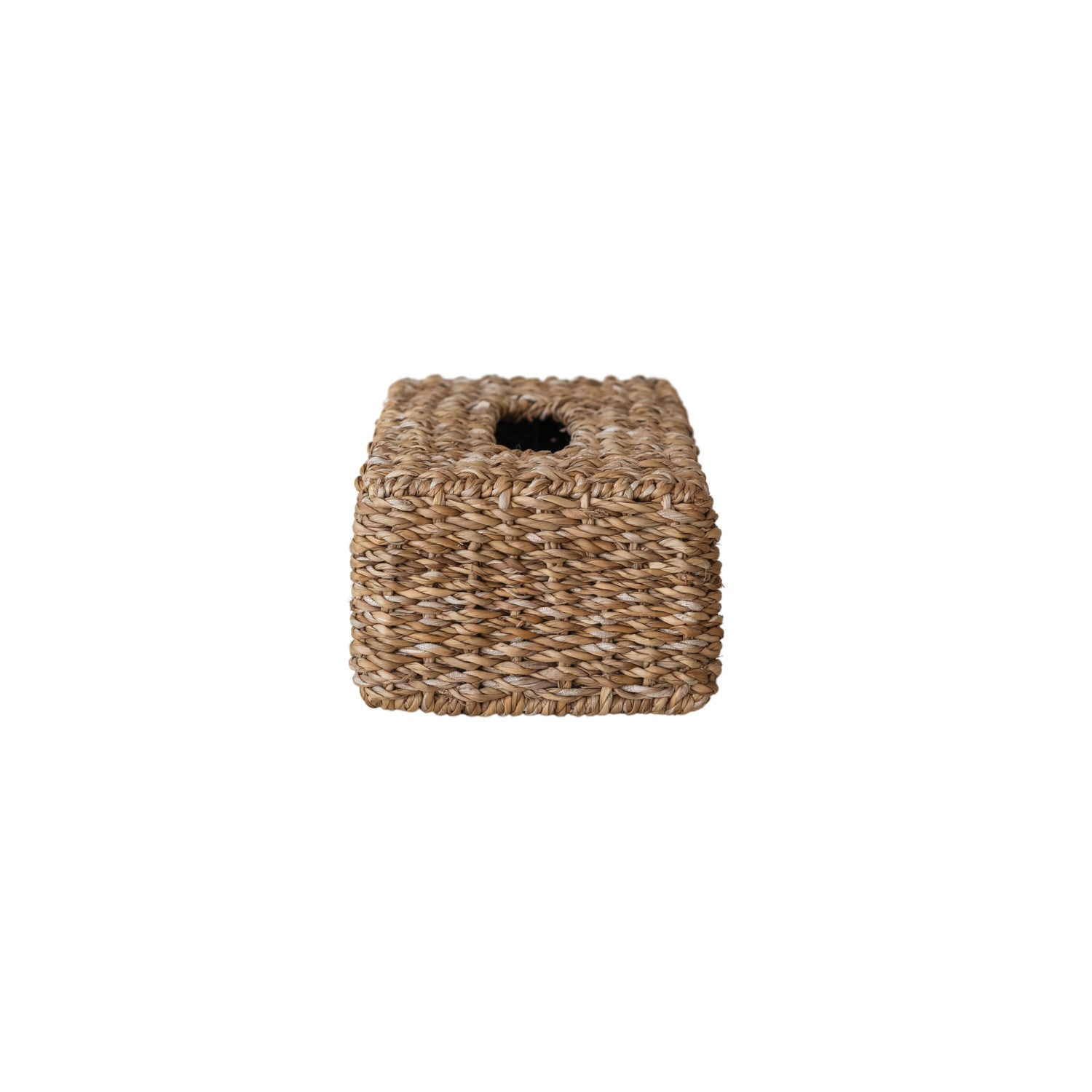 Hand-woven seagrass tissue box cover that fits standard rectangular tissue boxes. Natural finish.