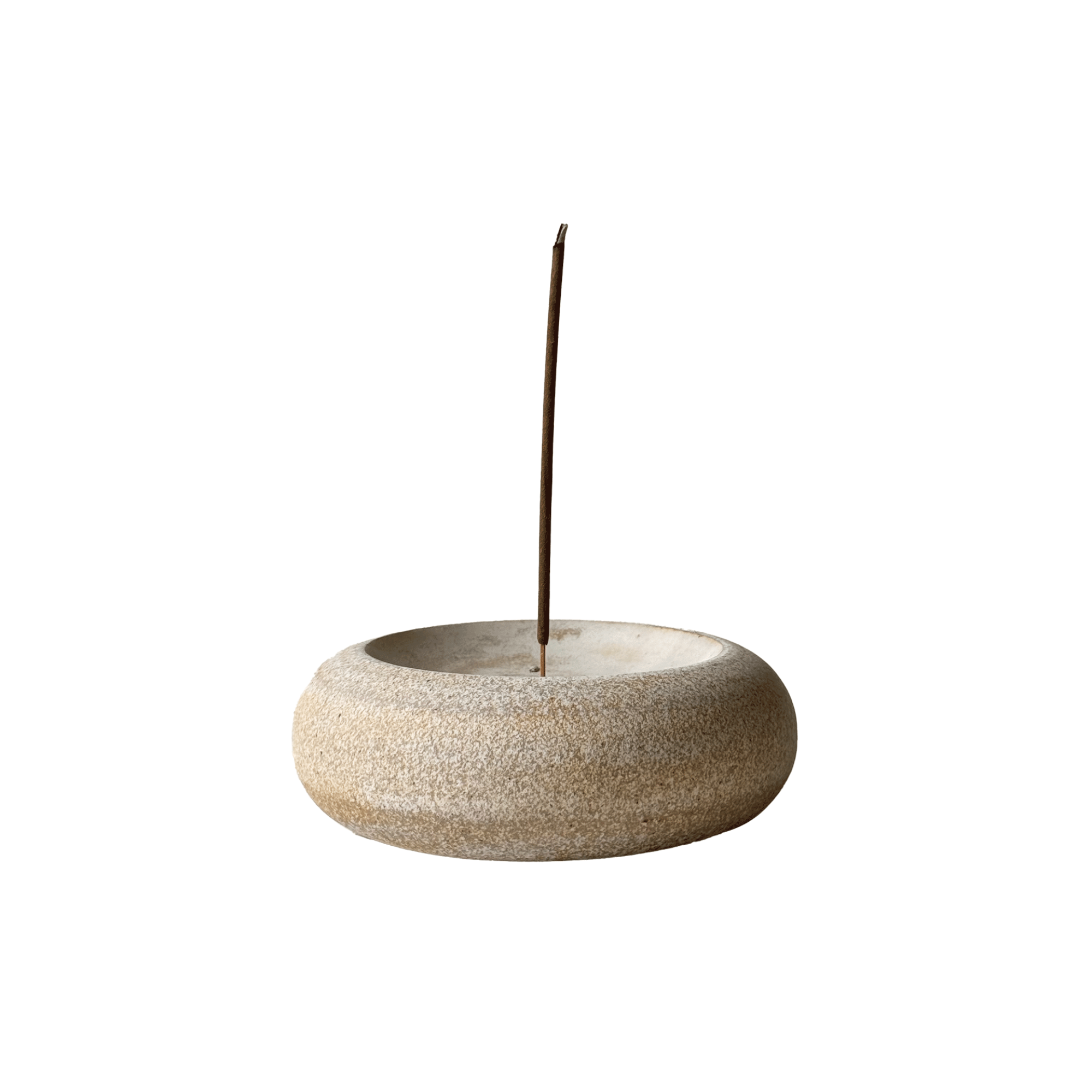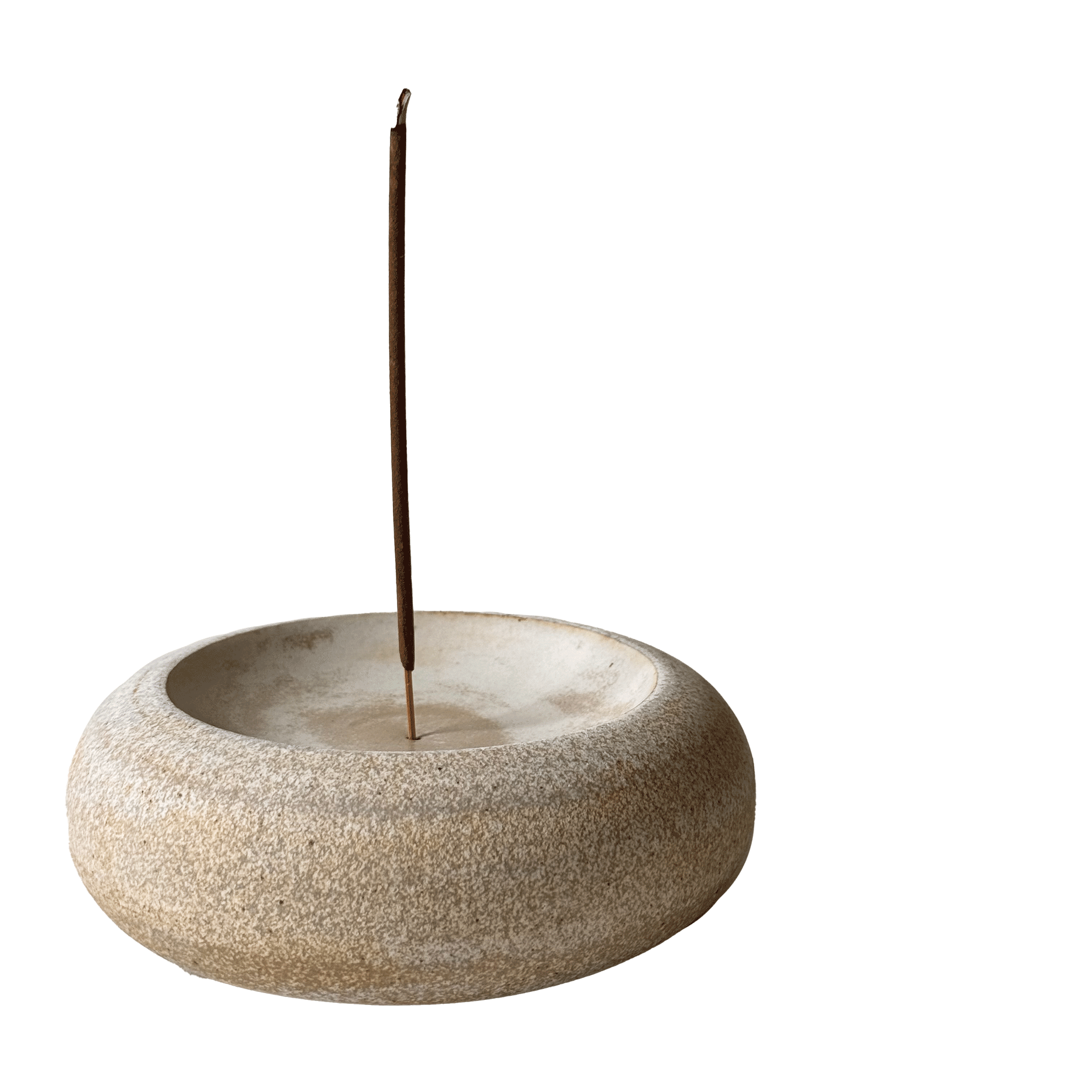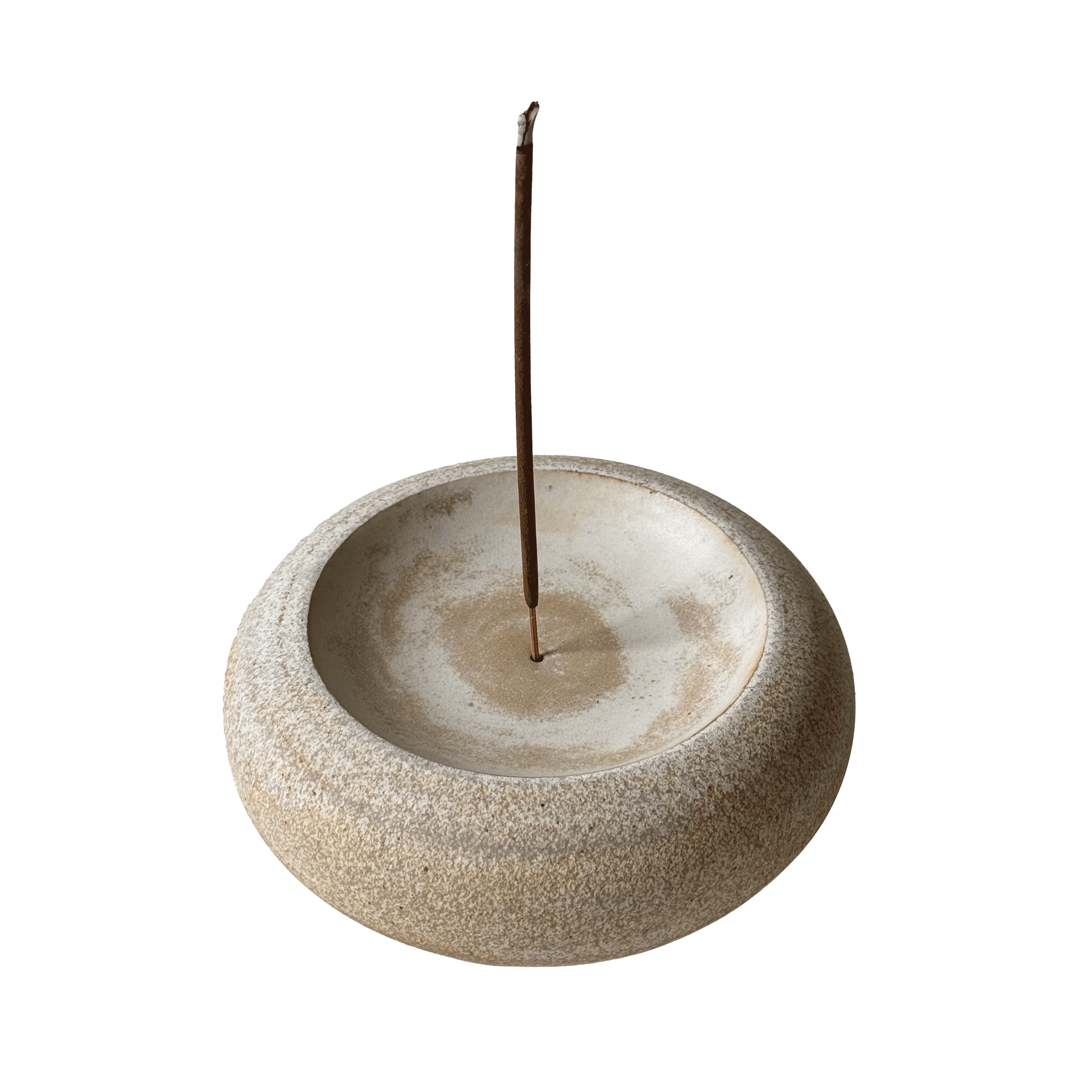 Designed with a traditional stick incense holder as well as a bowl for sage or palo santo. Wheel-thrown stoneware with glazed interior and raw ceramic exterior. Quartzite clay body ranges from creamy white to light gray. .