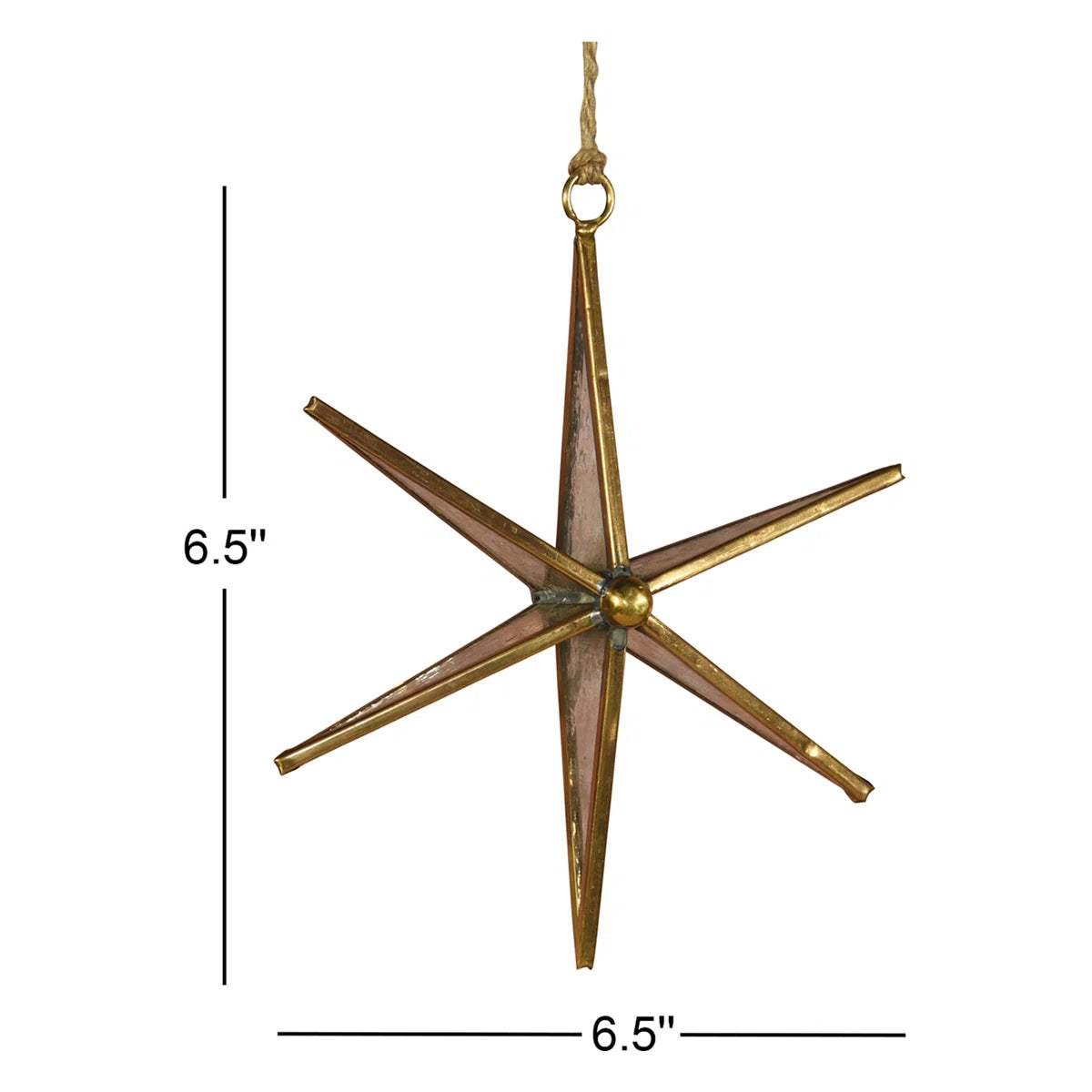 This stunning six-point star ornament brings timeless elegance to your holiday display. Featuring an antiqued brass metal frame paired with distressed mirrored glass panels, it catches and reflects light beautifully throughout your tree. Measuring 6.5" in both height and width, this statement piece commands attention with its sophisticated glamour. The included ornament hanger makes hanging effortless, so you can focus on creating the festive atmosphere you deserve this season. A perfect choice for adding vintage-inspired charm to your Christmas décor.